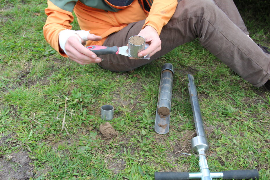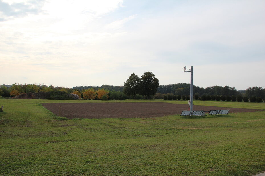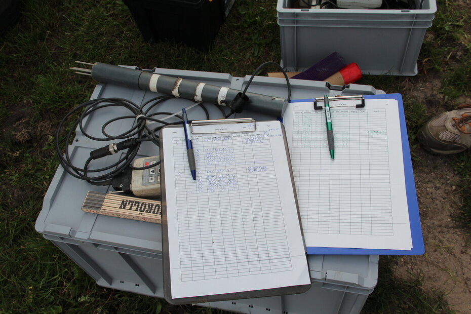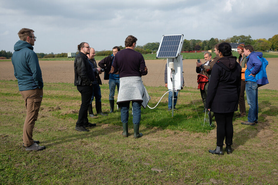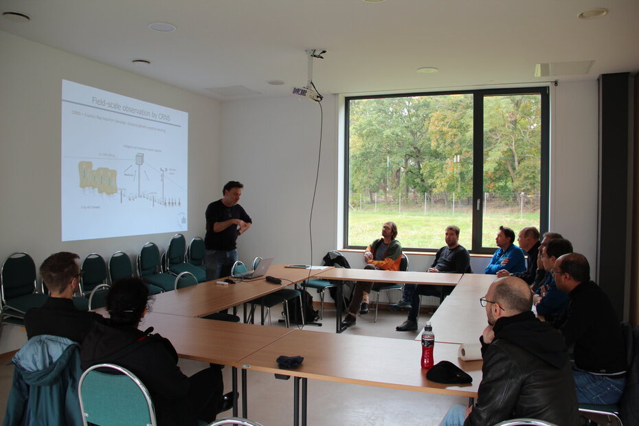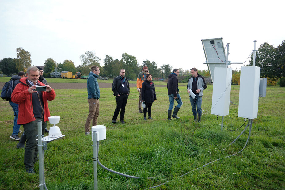 In connection with the project Kick-off meeting, on 13 October 2022, the partners visited the Marquardt site. This outdoor long-term observatory has been selected as one of SoMMet's three high-level test field sites, see: TEST FIELD SITES. A large suite of CRNS (Cosmic-Ray Neutron Sensing) sensors operated by the University of Potsdam (UP DE) are located on this site, alongside a network of point-scale soil moisture sensors and other instrumentation for meteorological and hydrological observations of relevant parameters. Following an introductory talk on the CRNS methodology, the project partners visited the site and undertook a hands-on exercise in measuring soil moisture under real outdoor conditions.