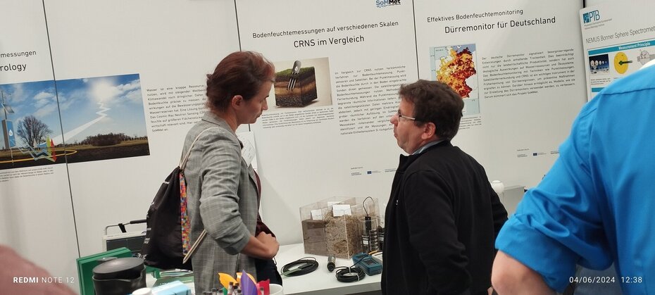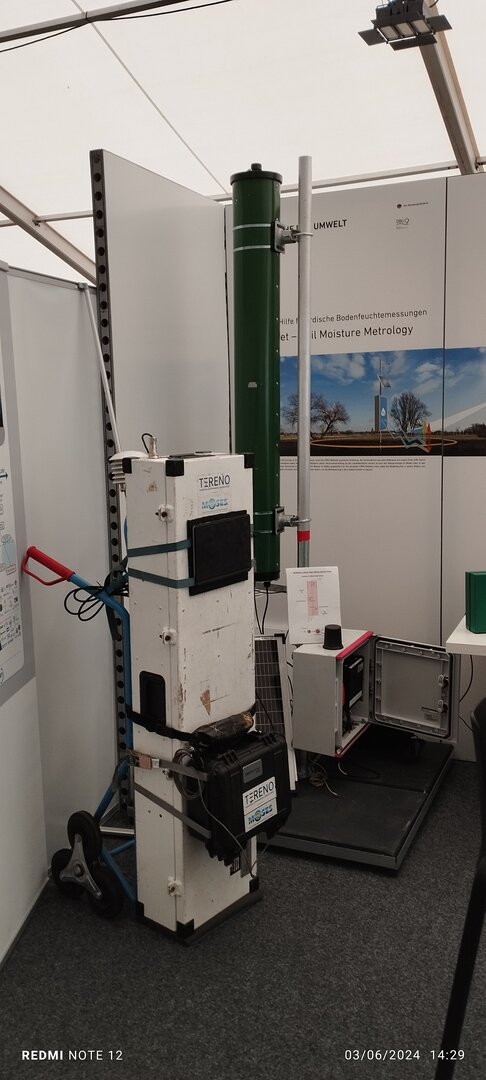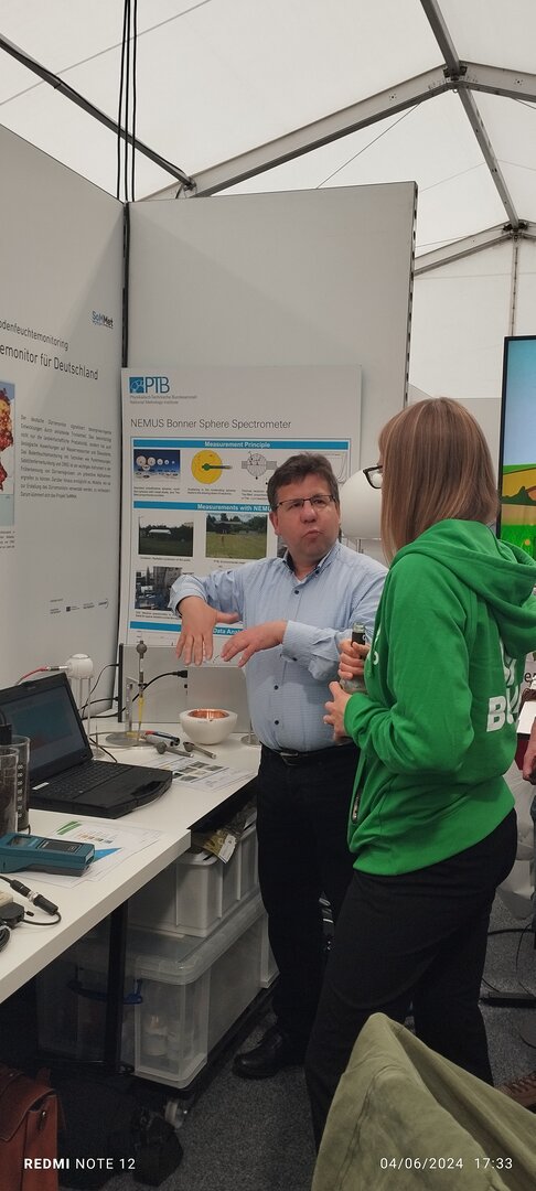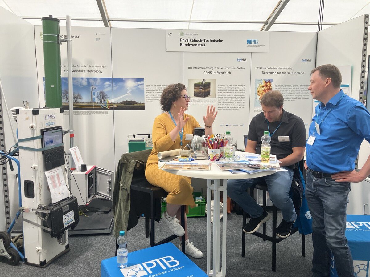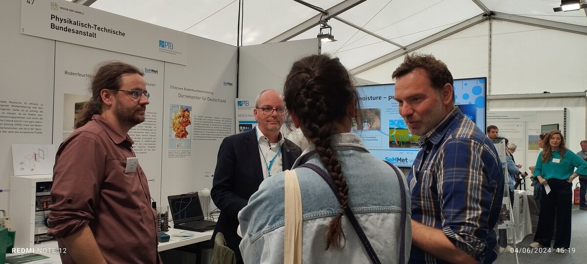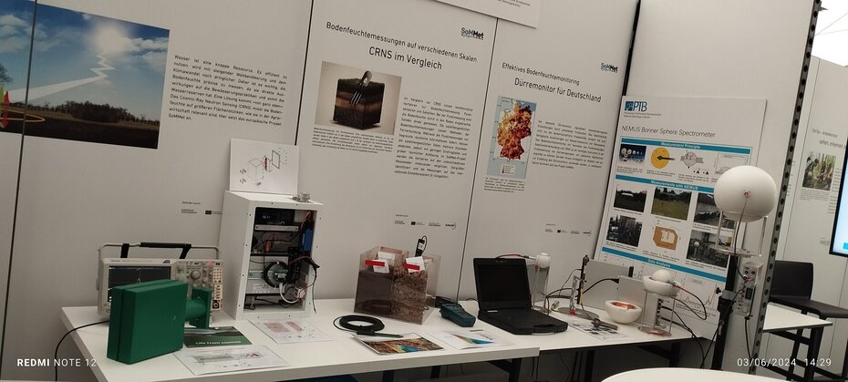 In addition to the PTB team, SoMMet partners from the University of Potsdam (UP DE), the Heidelberg University (UHEI) and the Helmholtz Centre for Environmental Research in Leipzig (UFZ) also attended the exhibition. There, they presented the topic 'Kosmische Hilfe für irdische Bodenfeuchtemessungen' (Cosmic support for terrestrial soil moisture measurements) together. Commercial CRNS systems were presented to a wide audience alongside a few examples of commercial point-scale soil moisture sensors. The UFZ partners' CRNS rover, which can perform mobile CRNS measurements, was exhibited in a live session. PTB's neutron spectrometer NEMUS, which is based on the Bonner sphere spectrometry principle, was also on display. In general, the audience was made aware of the need to establish a metrology foundation for measuring soil moisture at multiple scales.