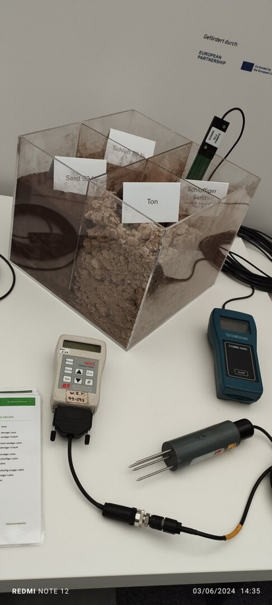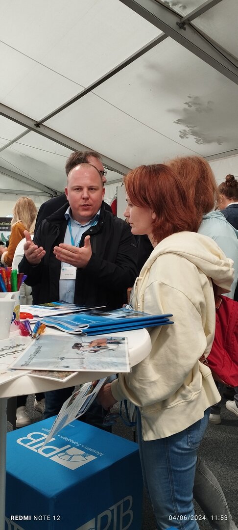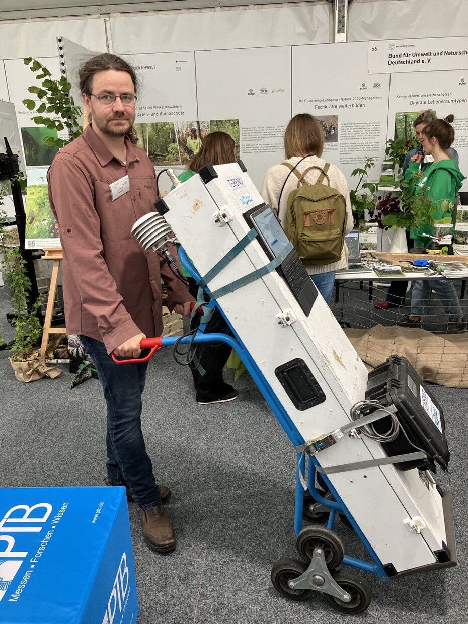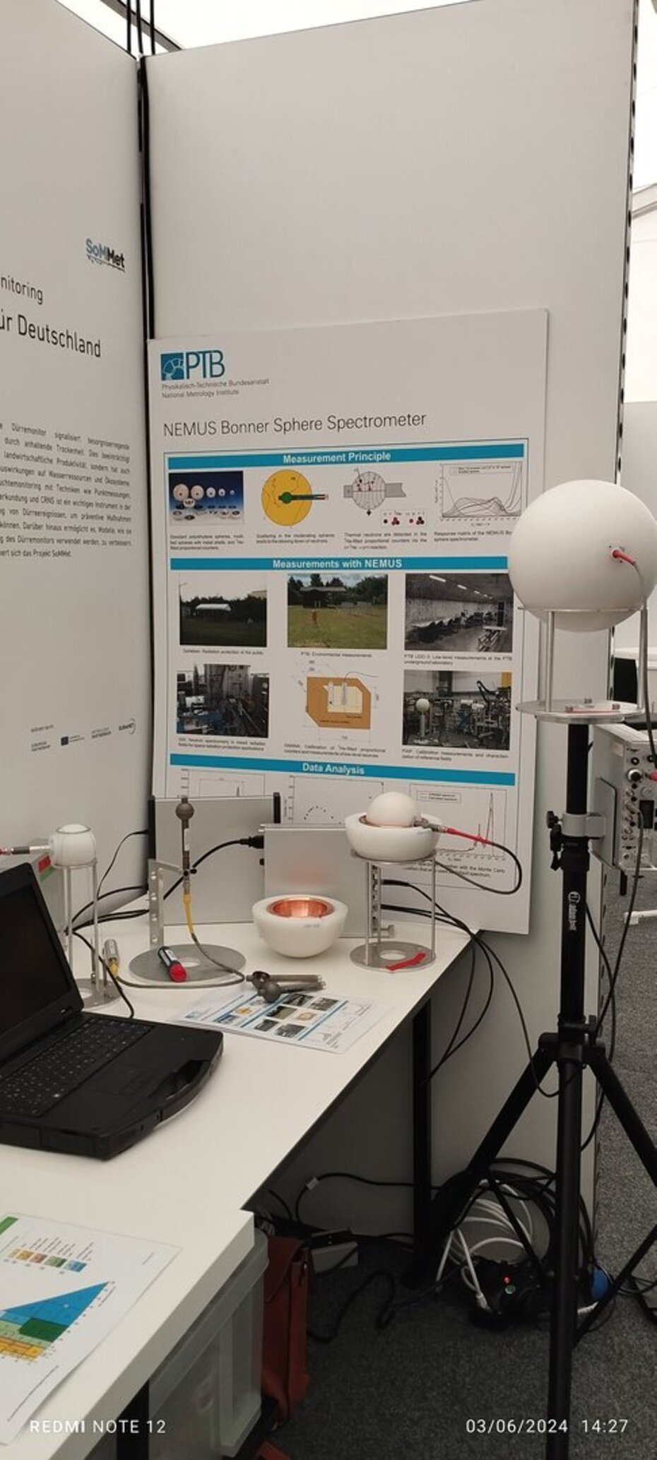 In addition to the PTB team, SoMMet partners from the University of Potsdam (UP DE), the Heidelberg University (UHEI) and the Helmholtz Centre for Environmental Research in Leipzig (UFZ) also attended the exhibition. There, they presented the topic 'Kosmische Hilfe für irdische Bodenfeuchtemessungen' (Cosmic support for terrestrial soil moisture measurements) together. Commercial CRNS systems were presented to a wide audience alongside a few examples of commercial point-scale soil moisture sensors. The UFZ partners' CRNS rover, which can perform mobile CRNS measurements, was exhibited in a live session. PTB's neutron spectrometer NEMUS, which is based on the Bonner sphere spectrometry principle, was also on display. In general, the audience was made aware of the need to establish a metrology foundation for measuring soil moisture at multiple scales.